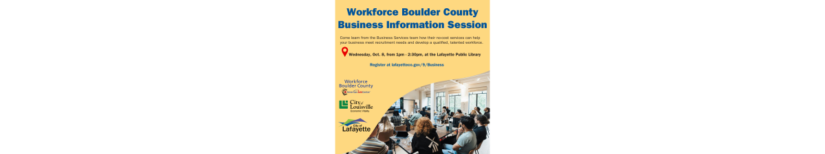 Are you interested in learning how Workforce Boulder County can help your business? Join them on Oct. 8 at 1pm at the Lafayette Public Library, to learn how they can help you recruit and retain a talented workforce! The business services team offers a variety of services including hiring events, job postings, and much more. Register at lafayetteco.gov/9/Business.